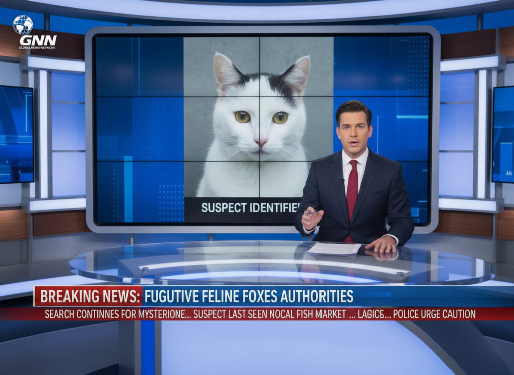 「皆さん、最新の衝撃ニュースです。FELINE FATALE、再びペットショップを狙いました。容疑者は白とグレーとブラウンの長毛が美しいラグドール系の猫で、青い瞳が印象的です。今朝、心斎橋の人気ペットショップ『にゃんこワールド』で、大量の毛糸玉と猫じゃらしが盗まれる被害が発生しました。」